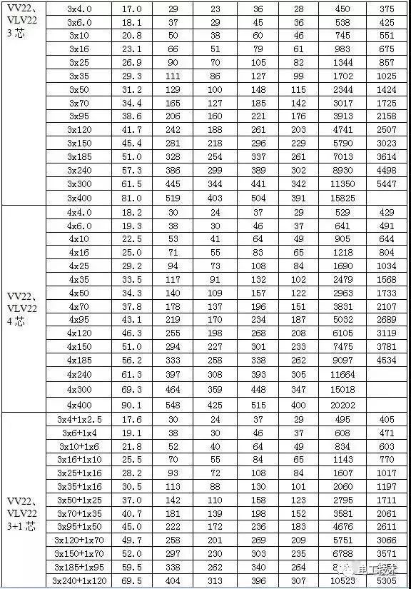 常見電纜的載流量一覽表